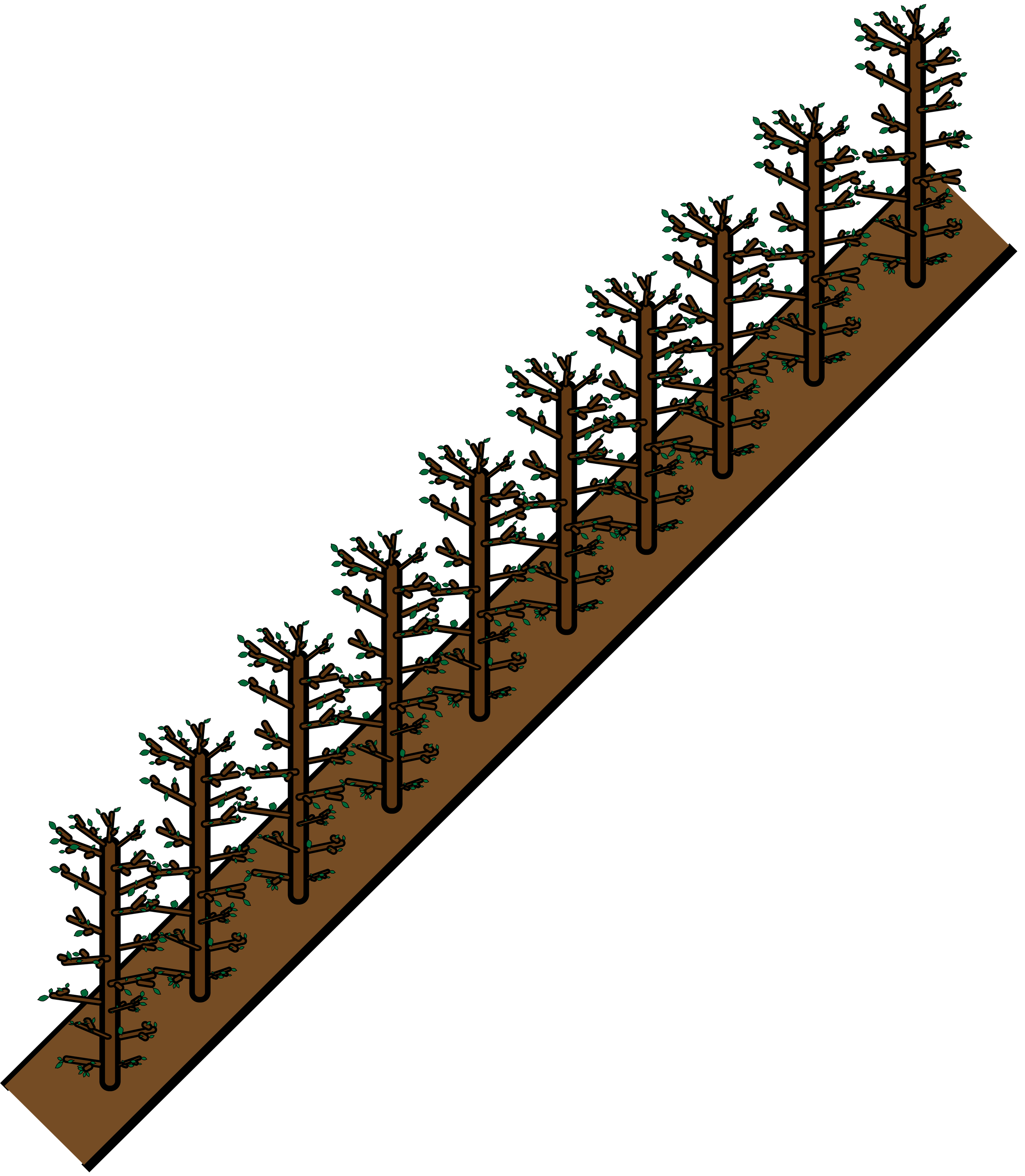 De planten staan nu netjes in rijen. De beste hoofdstam wordt gekozen en met een bamboe stok recht omhoog geleid. Ook wordt de penwortel doorgesneden en handmatig rondgestoken met een ronde spade, zodat de boom meer zijwortels maakt en later sterker groeit.